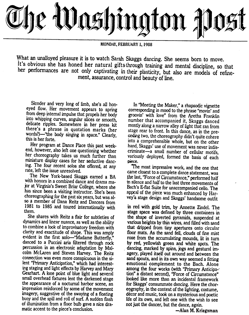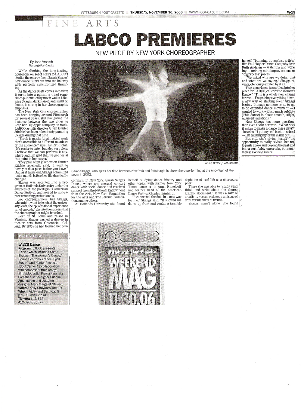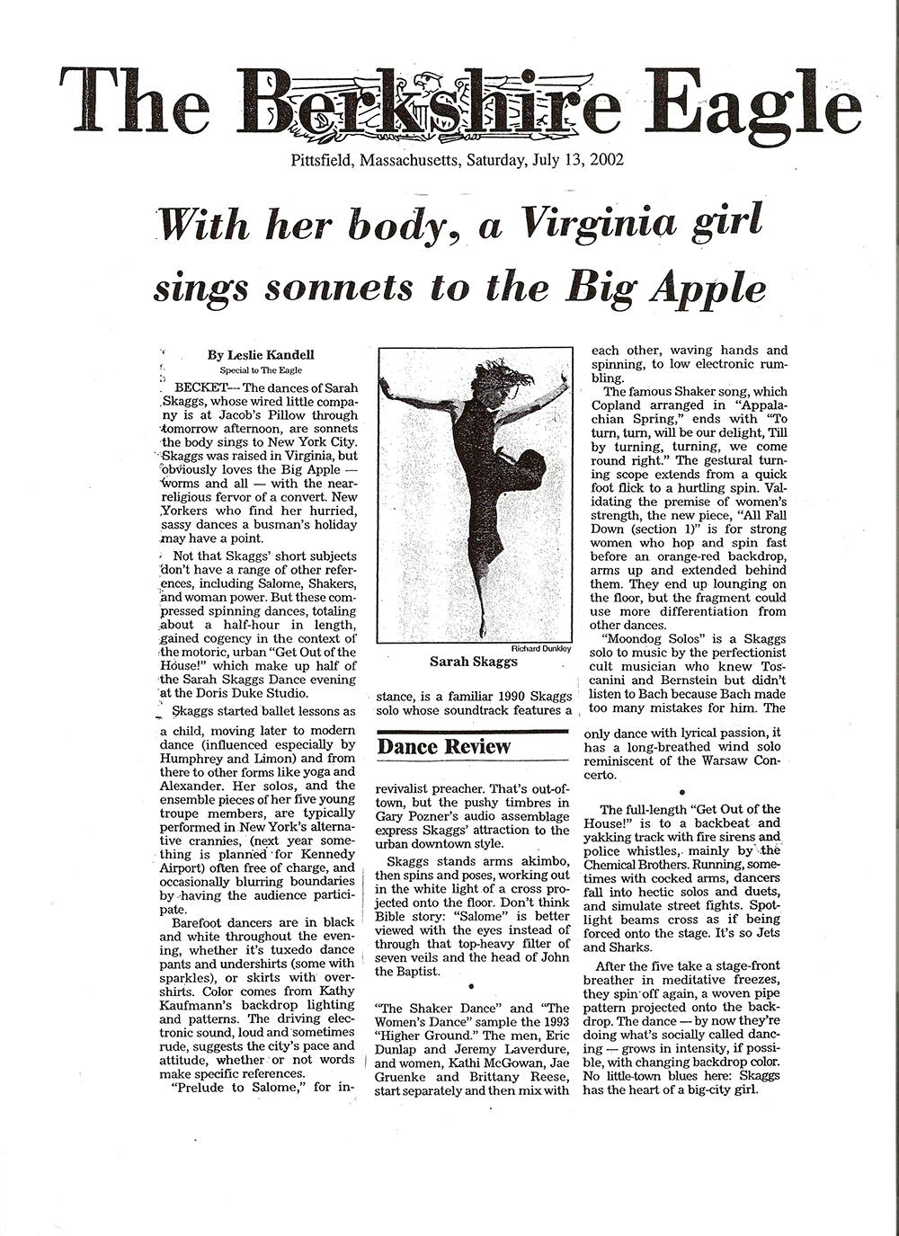The New York Times A Transcendence Grounded in Austere Contemplation Sarah Skaggs Presents ‘The New Ecstatic’ at Danspace By Gia Kourlas Published on October 8, 2013 |